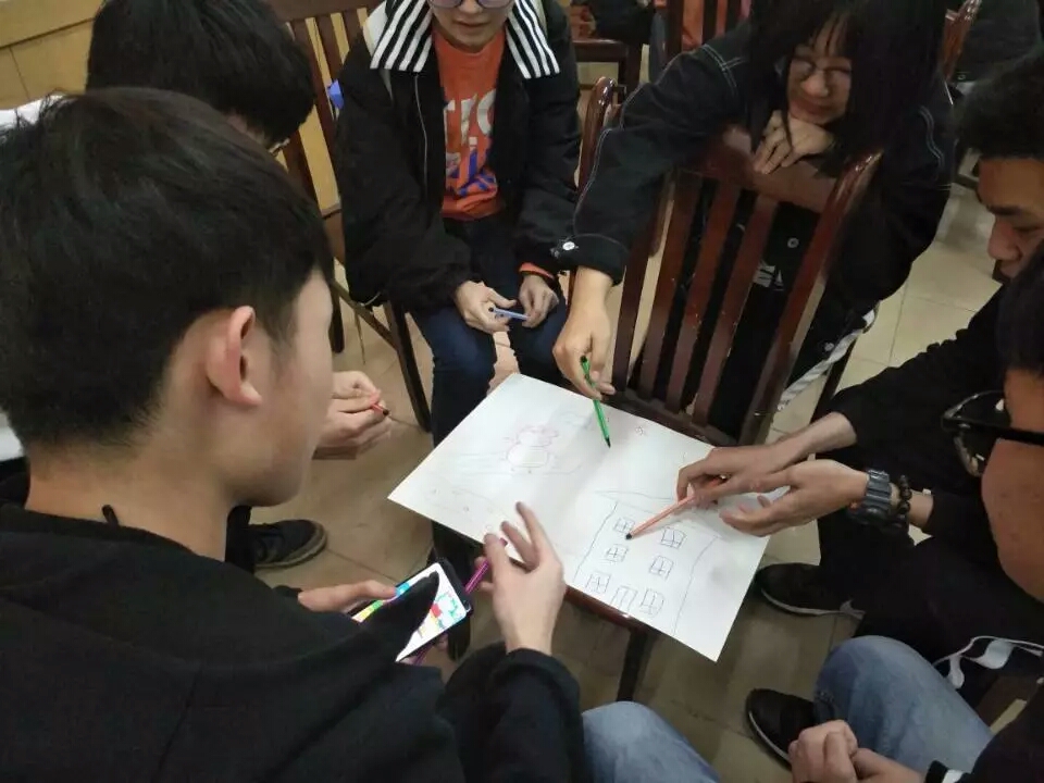 培训会的主题为"心动力,行动力"。培训会开始时,大一大二各班心理联络员在魏老师的带领下进行了"热身活动",气氛也变得轻松起来。魏老师以家的概念引出接下来的活动内容,引导大家共同参与到培训当中。在本次活动中,学员以分组的形式开展了一个小游戏,游戏也是以"家"为主线,让大家合作在画纸上描绘出对家的认识,从而对大家进行无声的教育,让大家认识到与同学平时相处时理解与尊重的重要性。