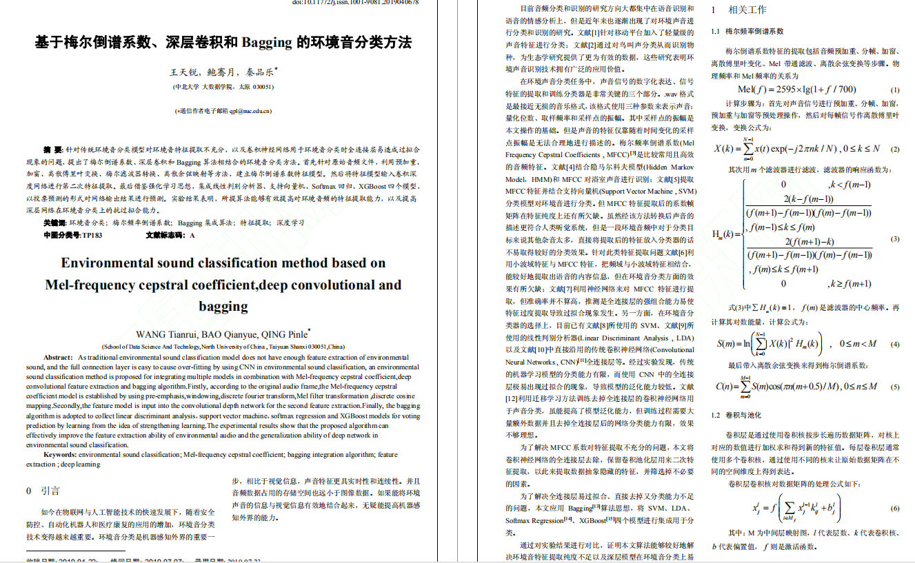 2019年8月,Android创新实验室16级学生负责人王天锐(物联网工程专业)和鲍骞月(数字媒体技术专业)同学在实验室秦品乐老师的指导下,在中文核心期刊《计算机应用》(中国计算机学会评选为优秀期刊)发表一篇学术论文《基于梅尔倒谱系数、深层卷积和Bagging的环境音分类方法》,已被中国知网(CNKI)检索。该文针对传统环境音分类模型对环境音特征提取不充分,以及卷积神经网络用于环境音分类时全连接层易造成过拟合现象的问题,提出了梅尔倒谱系数、深层卷积和Bagging算法相结合的环境音分类方法。实验结果表明,所提算法能够有效提高对环境音频的特征提取能力,以及提高深层网络在环境音分类上的抗过拟合能力。本论文是性爱片