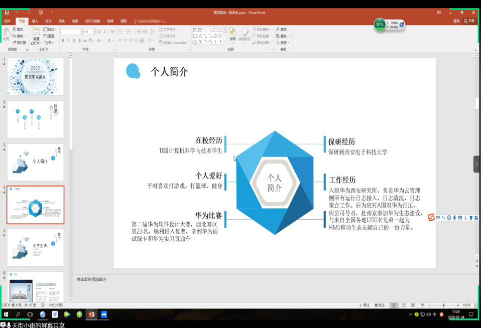 最后的主讲人张泽宇学长,2011级计算机科学与技术专业学生,2015年保研至西安电子科技大学。2018年毕业后入职华为西安研究所,后与来自全国各地1200名兄弟一起为HMS移动生态贡献自己的力量。泽宇学长从大学生活,勤工俭学,实验室,比赛及工作几个方面展开叙述,重点讲述了如何瞄准就业目标有计划有步骤的实现入职定级IT公司的过程。