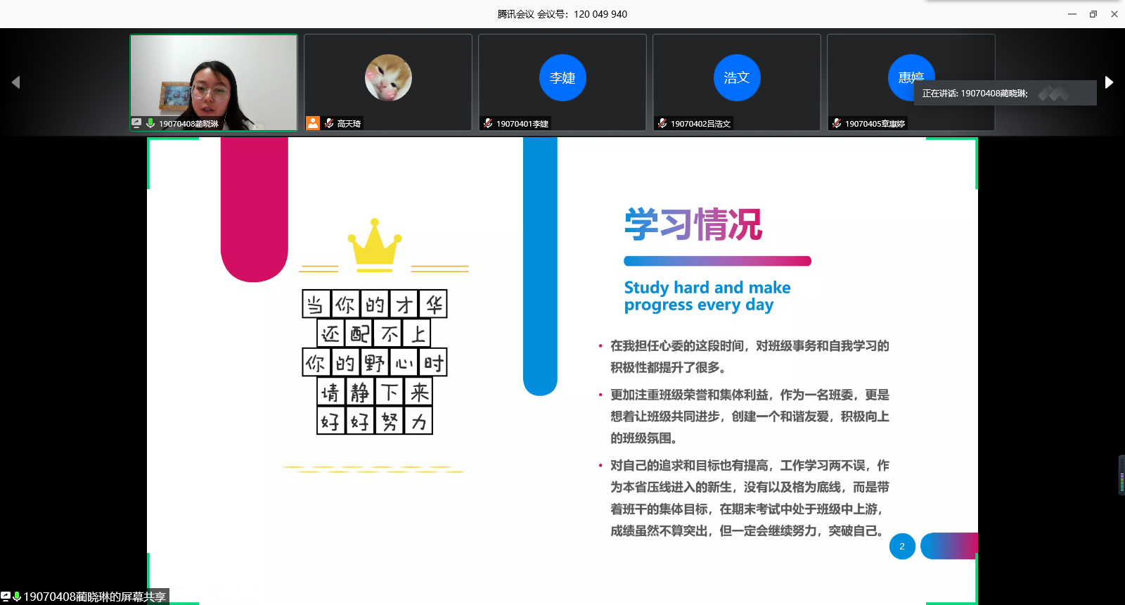 活动伊始,魏老师首先阐述了班级心理委员的职责和角色定位,随后八位心理委员依次进行答辩,他们利用幻灯片展示了自己担任心理联络员(信息员)期间的学习情况、工作业绩、感悟与经验。尤其是在疫情期间,各位心理委员都积极配合性爱片